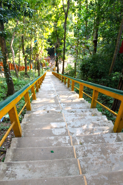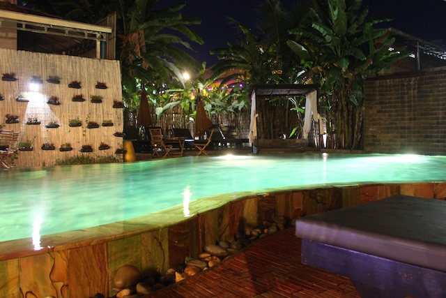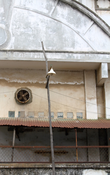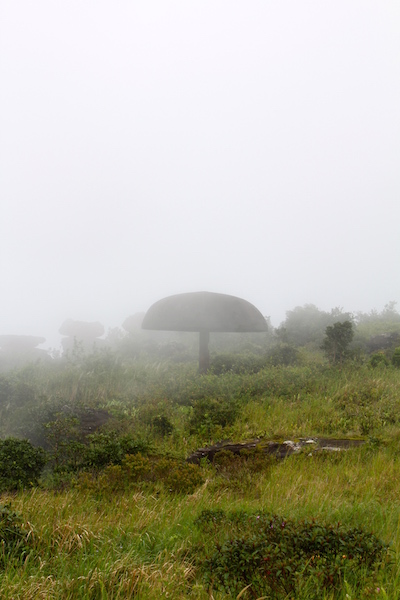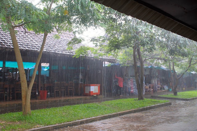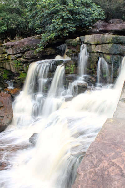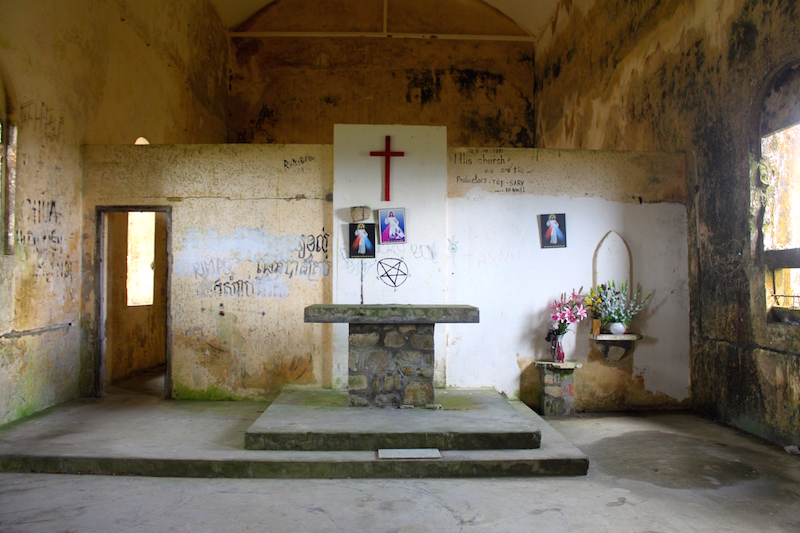 Für unseren Aufenthalt in Kampot hatten wir eigentlich weniger Zeit einberechnet, es hat uns aber so gut gefallen, dass wir zwei Nächte länger als geplant geblieben sind. Am Tag der Ankunft waren wir wie immer nach diesen Mini-Bus Trips ziemlich geschafft und suchten uns deshalb „nur“ ein nettes Café, in dem wir Pläne für die kommenden Tage schmieden konnten. Im „Bookish Bazaar“ gab’s jede Menge Bücher zum Kaufen, Tauschen oder Lesen. Eine tolle Idee, nur Lonely Planets of Cambodia nahmen sie nicht mehr in ihr Sortiment auf, da es schon unzählige Deutsch- und Englischversionen hatte. Am kommenden Tag mieteten wir gerade für die nächsten drei Tage einen Roller und kundschafteten „Bokor Hill“ aus. Die wunderschöne Passstrasse führte uns auf einen Hügel mit bizarrem Anblick. Zum einen stehen dort das alte Hotel, das ursprünglich den Franzosen als Ort diente, um von der Hitze im „Unterland“ zu fliehen, einige Hausruinen, die als letztes von den Khmer Rouge genutzt wurden sowie das neue, von den Chinesen erbaute Casino und einige Häuser. Die Chinesen haben diesen Hügel in einem 99-jährigen Vertrag geleast und planen wohl so etwas wie ein Resort daraus zu machen. Es schien aber eher eine Illusion als Realität zu sein. Auch eine wunderschöne, mit Moos überwachsene Kirche sowie einen Wasserfall fanden wir vor.