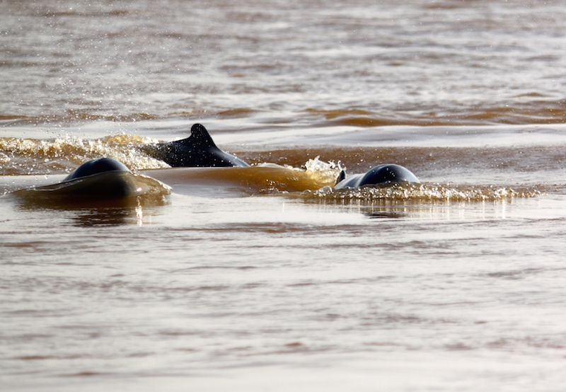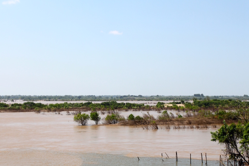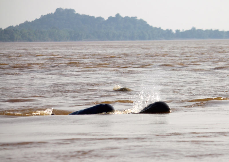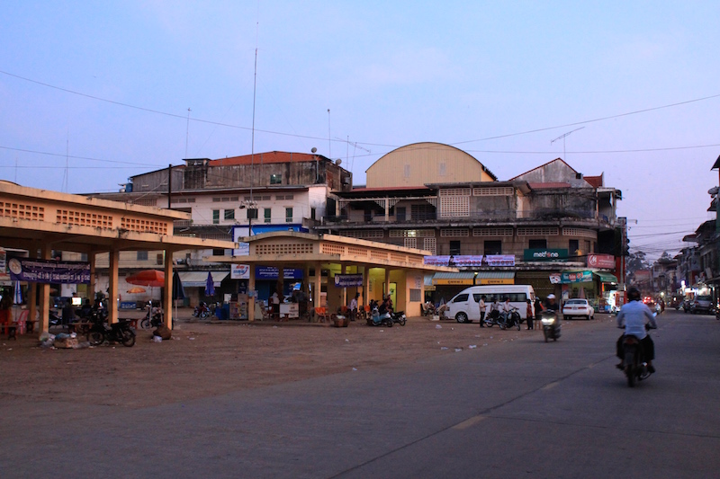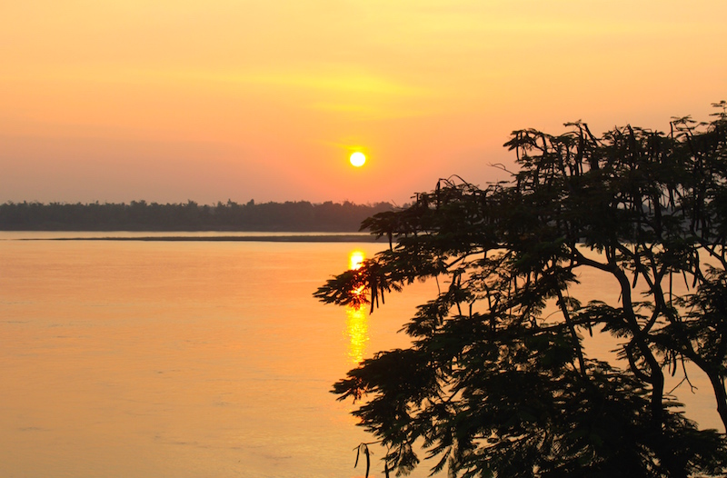 Eigentlich gab es nur einen einzige Grund, weshalb wir uns die fünfstündige Busfahrt nach Kratie angetan hatten: Die Irrawady Delfine im Mekong. Aber mal ganz von vorne. Die Übernachtungsmöglichkeiten in Kratie sind gezählt und so buchten wir ein Zimmer im Guesthouse „The Balcony“, welches als „Boat Cabin“ ausgeschrieben war. Ohne zu wissen, was uns da erwartet, kamen wir im schliesslich sehr netten Hostel an. Das Zimmer war dann auch nicht auf einem Boot, dafür hatte es einen Balkon mit Hängematte, zwei von vier Wänden liessen sich mittels Schiebetüren öffnen und das Ganze kostete uns pro Nacht gut investierte 8.- Fr. (für zwei Personen versteht sich). Wir genossen den Sonnenuntergang direkt vom Guesthouse aus und assen in einem Lokal, welches als Trainingscenter für Serviceangestellte gilt und unterstützten damit ein sinnvolles Projekt. Am kommenden Tag mieteten wir ein Tuk-Tuk mit Fahrer und tukerleten am Mekong entlang vorbei an typischen kambodschanischen Stelzenhäusern bis nach Sambour zur „100-Columns Pagoda“, die ihren Namen den 116 Säulen verdankt, die sie tragen. Der nächste Halt war Kampi, wo wir mit einem Boot den Mekong hinauffuhren zu den lang ersehnten Irrawady Delfine. Wir hatten das Glück noch vor dem Touristenrummel bei den Delfinen anzukommen und sie so wenigstens einen kurzen Moment „nur für uns zu haben“. Zum Abschluss unserer Tour wollten wir eigentlich noch die Pagoda „Phnom Sombok“ besuchen, unser Aufstieg wurde aber nach der ersten Terrasse von fauchenden Affen verhindert. Tatjana, die schon eine Affenattacke hinter sich hatte, war skeptisch, ich wollte es aber mit Holzstab als Waffe nochmals versuchen, doch die Tiere waren zu aggressiv. Also machten wir rechts und kehrt und fuhren ins Guesthouse zurück, wo uns ein weiterer, atemberaubender Sonnenuntergang erwartete. Den restlichen Abend verbrachten wir mehrheitlich an der Bar, wo sich ein paar weitere Gäste ansammelten und sich schliesslich ein gemütlicher Abend ergab.
