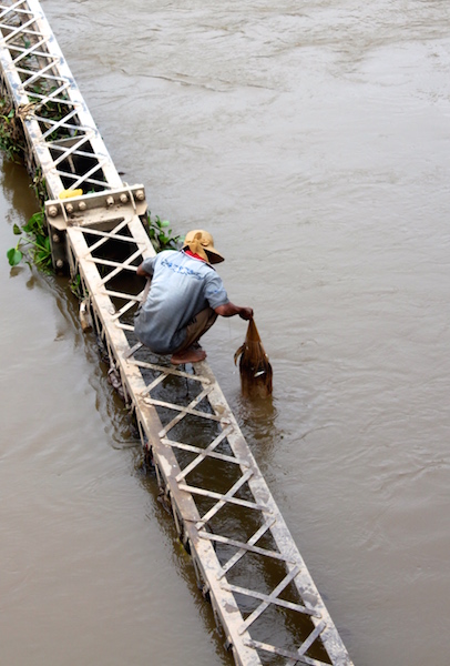 Die zweitgrösste Stadt Kambodschas (nach Phnom Penh; ca. 200’000 Ew.) wirkt trotz seiner Grösse ruhig und gemütlich. Wie in Kambodscha üblich, gehört die Architektur aus der französischen Kolonialzeit (1863 – 1953) zum Stadtbild, mit einigen am besten erhaltenen Gebäuden im ganzen Land. Wir nahmen dies zu Anlass und liefen den „Heritage Trail“ der Stadt ab, der uns an vielen in dieser Zeit erbauten Gebäuden vorbei führte. Am zweiten uns schon wieder letzten Tag unseres Battambang-Aufenthaltes, mieteten wir ein Tuk-Tuk für einen halben Tag und liessen uns in und um Battambang herumführen. Eindrücklich war ein kleines Fischerdorf, das von Muslimen, die in Kambodscha eine Minderheit darstellen, bewohnt wird. Die Lebensbedingungen, die ja schon im Allgemeinen relativ schlecht sind, schienen dort nochmals schlechter zu sein. Wir parkierten unser Tuk-Tuk und sahen uns ein wenig um, hatten unser Gefährt dann innert kürzester Zeit mit einer Schar von Kindern beladen, die das wohl nicht alle Tage zu Gesicht bekommen. Sie lachten und winkten uns zu als ob wir von einem anderen Planet kämen (naja, für sie mag das vielleicht sogar stimmen). Einen weiteren Stop machten wir bei dem ersten Weingut in ganz Kambodscha und degustierten einen Rotwein, Brandy (Grappa), Trauben- und Ingwersaft. Da letztere sehr gut schmeckten, erstaunt es nicht, dass der Rotwein mehr Ähnlichkeiten mit Essig als mit Rotwein wie wir ihn kennen aufwies. Der Brandy hingegen schmeckte gut, obwohl es erst 11 Uhr morgens war. Am frühen Nachmittag waren wir zurück von unserer Tour, wir waren aber beide müde und ich ziemlich erschlagen von all diesen Eindrücken, sodass wir uns einen gemütlichen Nachmittag im Hotel gönnten.