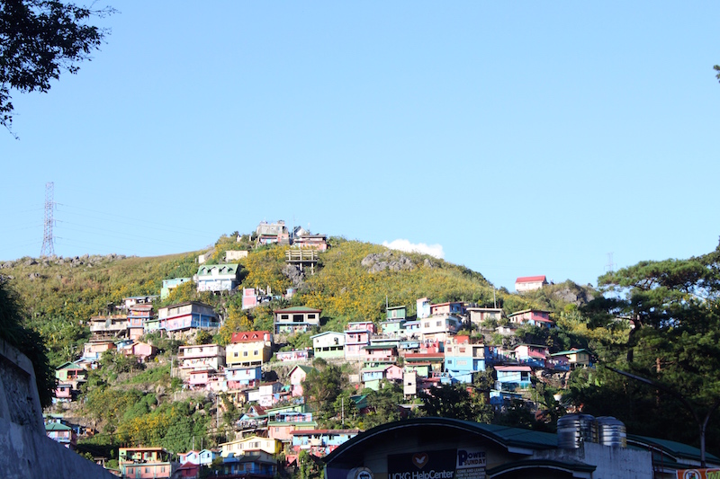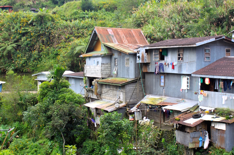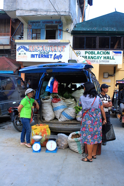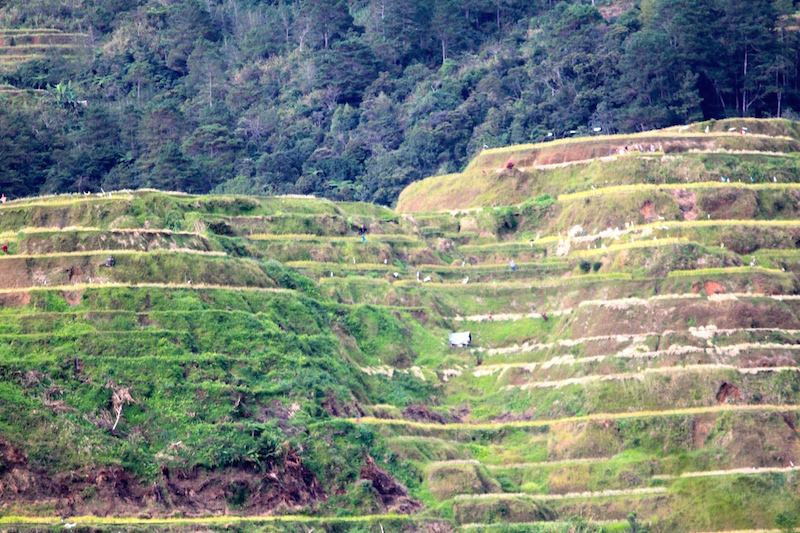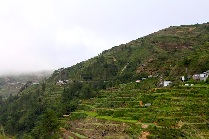 Ursprünglich wollten wir bereits einen Tag früher abfahren, konnten dies aber wegen einem Sturm und heftigen Regenfällen nicht realisieren. Zum Glück ist uns auch noch ein Fehler bei den Hotelbuchungen unterlaufen, sodass wir die Route dann einfach in die entgegengesetzte Richtung gefahren sind, was dann auch unserer Buchung entsprach. Zuerst ging es nach Baguio, ein mittelgrosses Städtchen nordwestlich von Angeles, wo wir stationiert waren. Nach dem Hotel Check-in erkundeten wir die Stadt, liefen durch einen Park inklusive Rosengarten (obwohl der in Bern schöner ist), weiter vorbei an einem Teich, indem unzählige Tretboote und andere kleine Boote in herzigen Sujets herumkurvten. Nach einer kurzen Kaffeepause, besichtigten wir eine Kirche, in der gerade einen Gottesdienst stattfand und deshalb völlig überfüllt war (ja, hier gehen die Leute offensichtlich noch zur Kirche!). Nachdem Myrna ein paar Pflanzen gekauft hatte (das gehört sozusagen zum Standardprogramm), schlenderten wir durch einen Markt. Von Erdbeeren, geflochtenen Körben bis hin zu getrockneten Fischen und Kleidern hätte man wirklich alles kaufen können. Bevor es dann ins Apéro ging, besuchten wir noch einen chinesischen Tempel in der Nähe unseres Hotels. Die Kinder und Jugendlichen waren fleissig am Üben, wie man einen Drachen in der Luft schwingt oder Tänze aufführt. Interessant war, dass in dem Tempel die fünf Weltreligionen mittels Statuen vertreten waren, der Tempel sozusagen allen Gläubigen, egal welcher Religion, offen steht. Nach dem Apéro und Nachtessen im Hotel, welches äusserst dürftig war, liessen wir den Abend mit einem Glas Rotwein und ein paar Runden UNO ausklingen. Am nächsten Morgen ging es bei Zeiten weiter Richtung Banaue, wo wir Reisterrassen anschauen wollten. Die Fahrt dauerte ungefähr sieben Stunden, obwohl es nicht einmal 300km waren, aber die Strassen waren schmal, extrem kurvig und führten über einige Berge. Kurz bevor wir die Terrassen erreichten, zog ein dicker Nebel auf, worauf wir befürchteten, dass wir von den Reisterrassen nicht viel zusehen bekämen. Als wir unser Ziel aber erreichten, lockerte sich der Nebel und die Landschaft präsentierte sich in einmaligen Farben. Nach einem kurzen Abstecher im Hotel besuchten wir auch in Banaue einen Markt, auf dem Myrna tonnenweise Gemüse einkaufen wollte. Ich genoss es natürlich sehr, auf einem lokalen Markt mit einer Person, die die Sprache spricht einzukaufen und die verschiedenen Gemüsearten endlich auch mal „antöpeln“ zu können ;-). Nach dem Apéro in einem französischen Bistro ging’s zurück in das Gasthaus, welches sehr herzig oberhalb von Bananenbäumen und Reisterrassen gelegen war. Wegen der Fahrt waren alle ziemlich erschöpft und zögerten nicht lange, nach dem Nachtessen gleich das Bett aufzusuchen. Felix und ich fanden den Balkon und die angefangene Flasche Wein aber zu verlockend und blieben noch etwas auf. Am nächsten Tag war bereits die Rückfahrt geplant und wir machten uns früh auf die Socken. Nach acht Stunden Reise erreichten wir schliesslich Angeles.